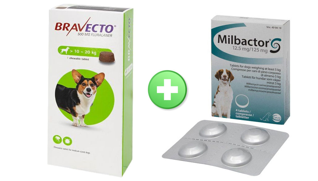 Description Bravecto 500mg Chewable Tablets are an innovative treatment for flea and tick infestations in dogs weighing 10 - 20kg. Containing an extoparasticide called Fluralaner that works quickly and effectively to kill fleas and ticks for up to 12 weeks in a single dose, Bravecto will also provide effective treatment for demodicosis and sarcoptic mange. Bravecto can also be used as part of a treatment strategy for the control of flea allergy dermatitis (FAD). Each Tablet Contains: 500mg Fluralaner Tablets sold individually. Milbactor tablets are used to prevent and treat roundworms and tapeworms in dogs.