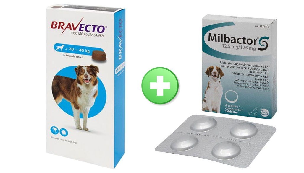 Description Bravecto 1000mg Chewable Tablets are an innovative treatment for flea and tick infestations in dogs weighing 20 - 40kg. Containing an extoparasticide called Fluralaner that works quickly and effectively to kill fleas and ticks for up to 12 weeks in a single dose, Bravecto will also provide effective treatment for demodicosis and sarcoptic mange. Bravecto can also be used as part of a treatment strategy for the control of flea allergy dermatitis (FAD). Each Tablet Contains: 1000mg Fluralaner Tablets sold individually. Milbactor tablets are used to prevent and treat roundworms and tapeworms in dogs.